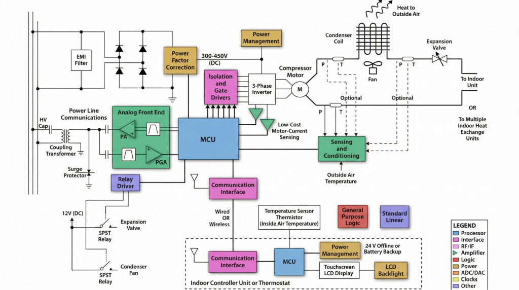Additional outputs from the MCU control the electronic expansion valve and the outdoor fan for efficient heat exchange. The Communication Interface provides wired or wireless connectivity, while the Indoor Unit/UI handles user controls, thermostat signals, and display functions.