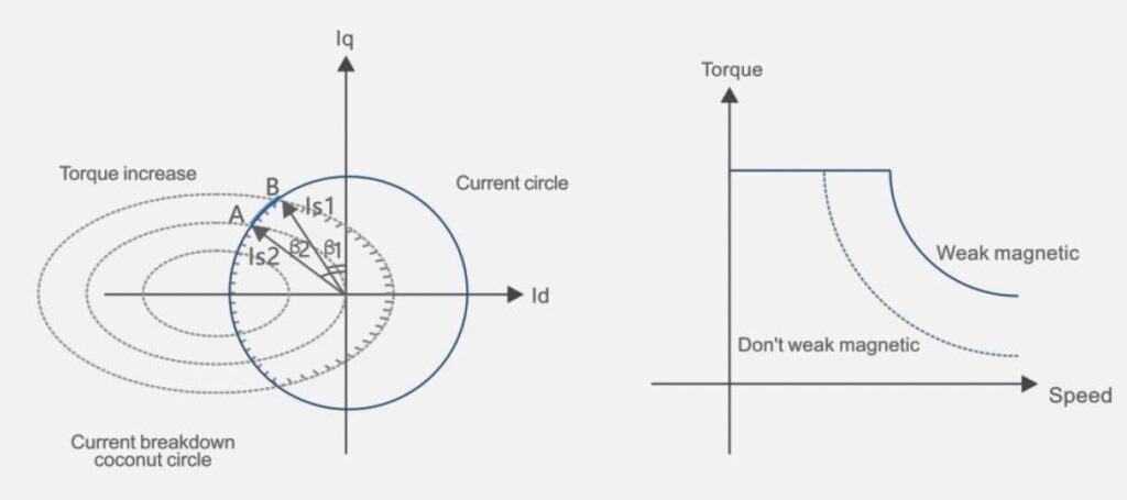 When the end voltage of the motor reaches its maximum, it can only operate by decreasing the excitation current and increasing its speed. The motor current consists of torque current (Iq) and excitation current (Id).