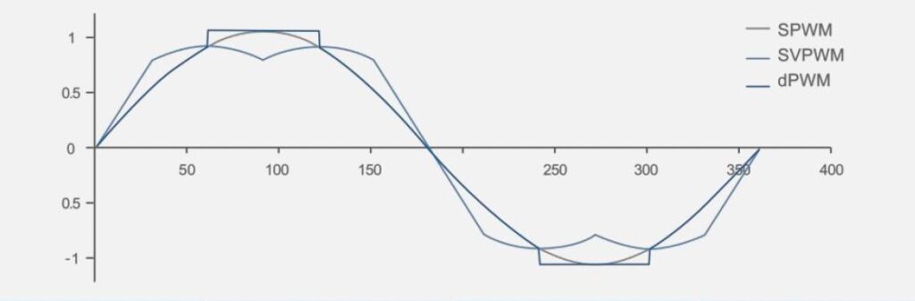 Comparison of SPWM, SVPWM, and SVPWM with third-harmonic injection showing improved DC bus utilization.