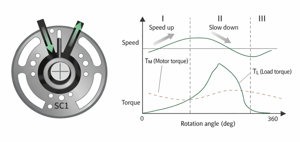 The traditional constant torque control method outputs myopic constant motor torque within a week, which does not match the load torque, resulting in acceleration and deceleration in a week of rotation, as shown in the figure on the right, resulting in vibration and noise problems of the compressor.